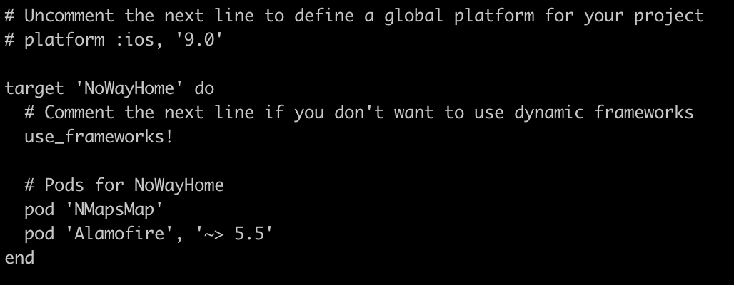 Podfile에 적는 내용은 코코아팟 사이트에서 검색하여 볼 수 있습니다.