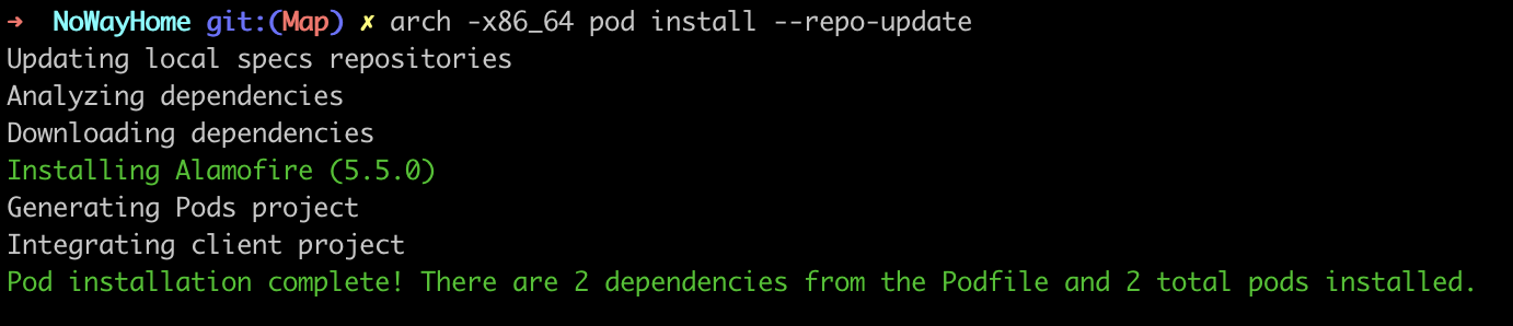 그 후 pod install을 하면 됩니다. 이때 M1 맥북에서는 에러가 날 수 있는데 그럴 때는 위 사진처럼 arch -x86_64를 붙여서 실행해 주세요. 아직도 코코아팟과 애플 실리콘(M1)과의 연동성 문제가 있는 것 같습니다.😭