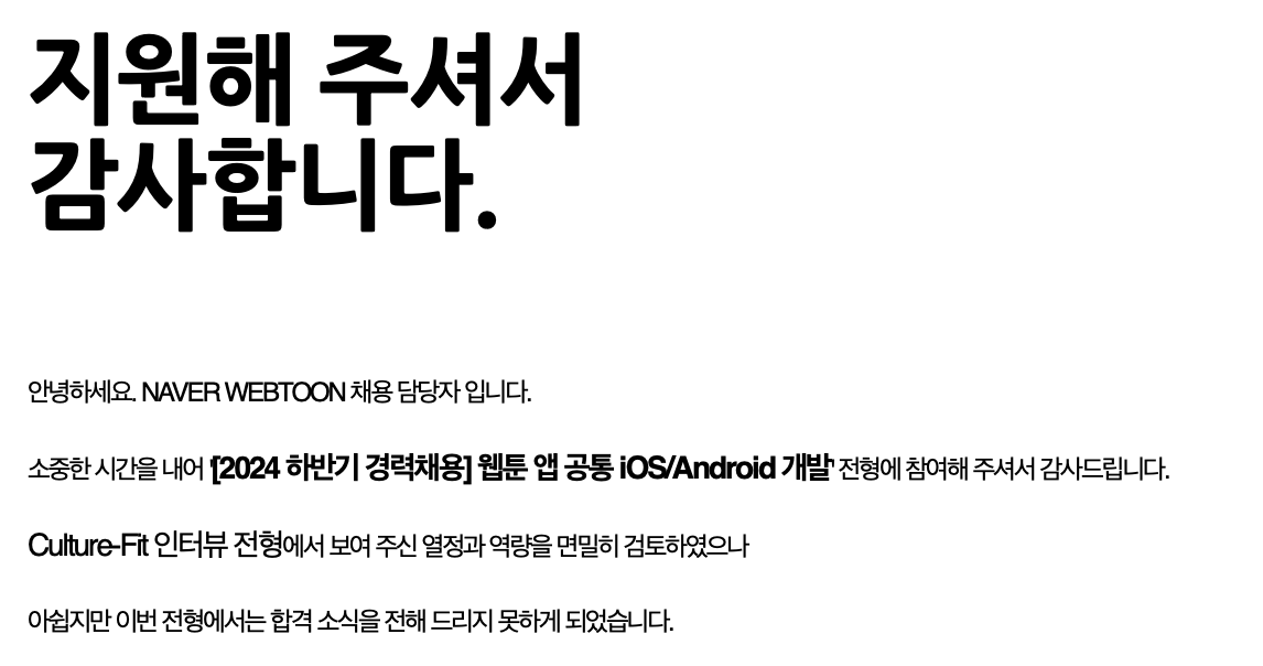 회사에서 겪은 경험에서 부정적인 점이 있다면 긍정적인 점도 있는 건데 저는 부정적인 점만 강조했습니다. 그 결과 지금 다니는 회사에 애정이 없는 사람이 네이버웹툰에 와서 애정을 가질까?라는 점을 걱정하셨을 거 같습니다.